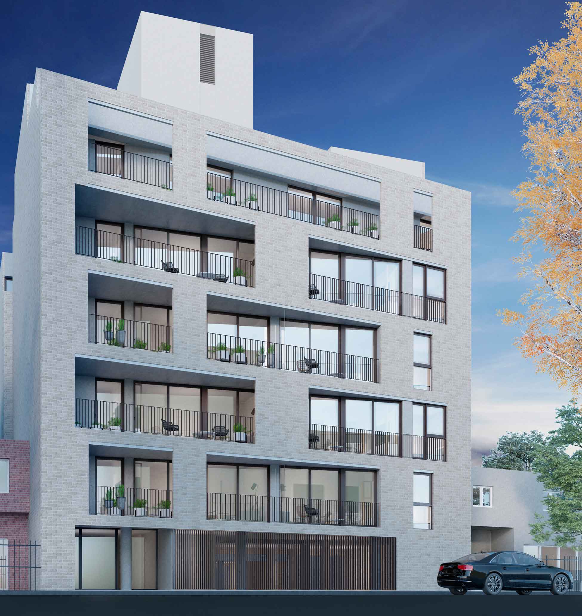 Dos cuerpos de 6 pisos y doble frente, separados por un vacío de 9 x 17 metros. Planta baja libre, de acceso peatonal y cocheras.